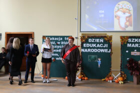 W dalszej części uroczystości pani dyrektor Ewa Gano odczytała nazwiska nauczycieli odznaczonych medalami oraz nagrodzonych przez Starostę Górowskiego oraz Kuratora Oświaty we Wrocławiu.