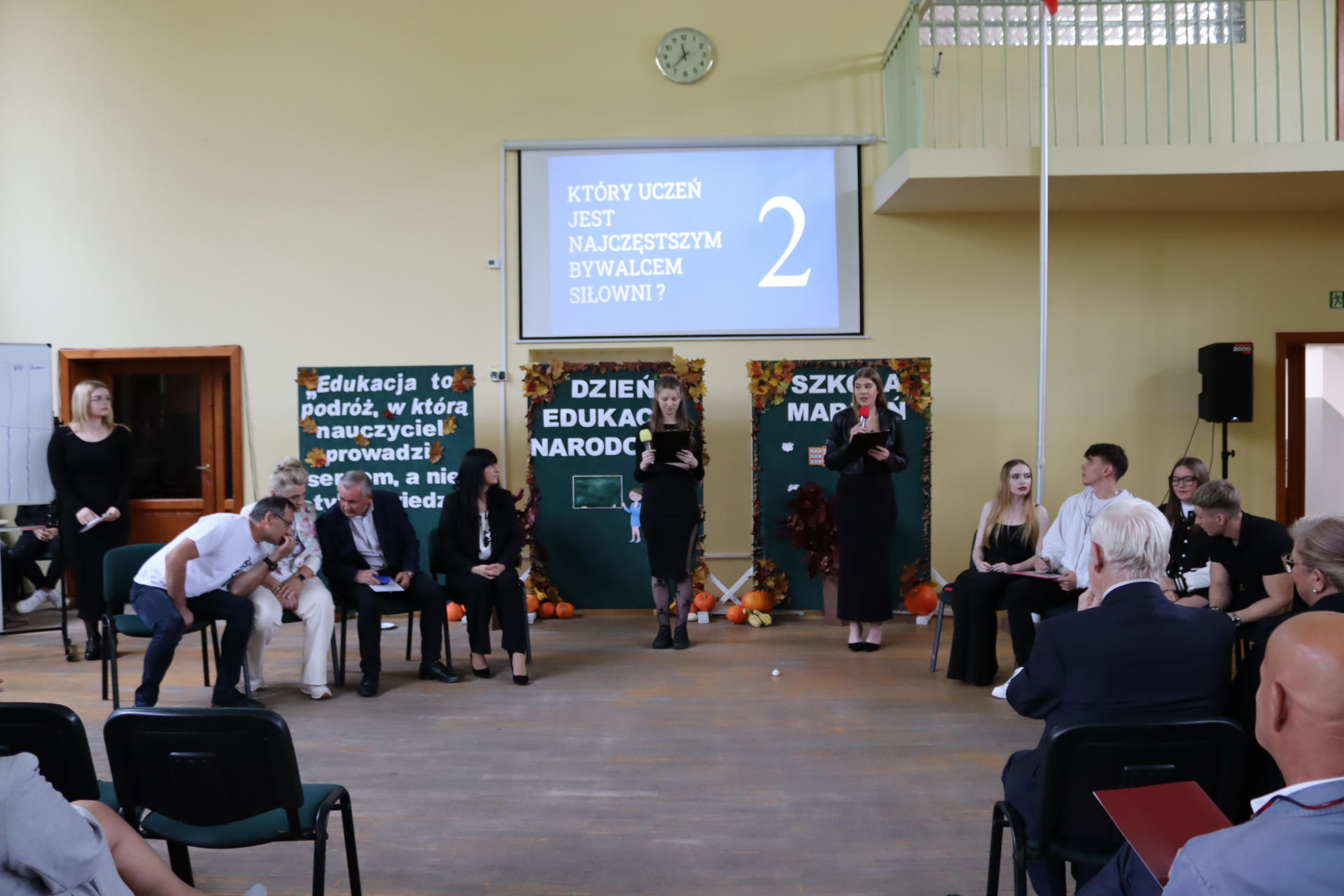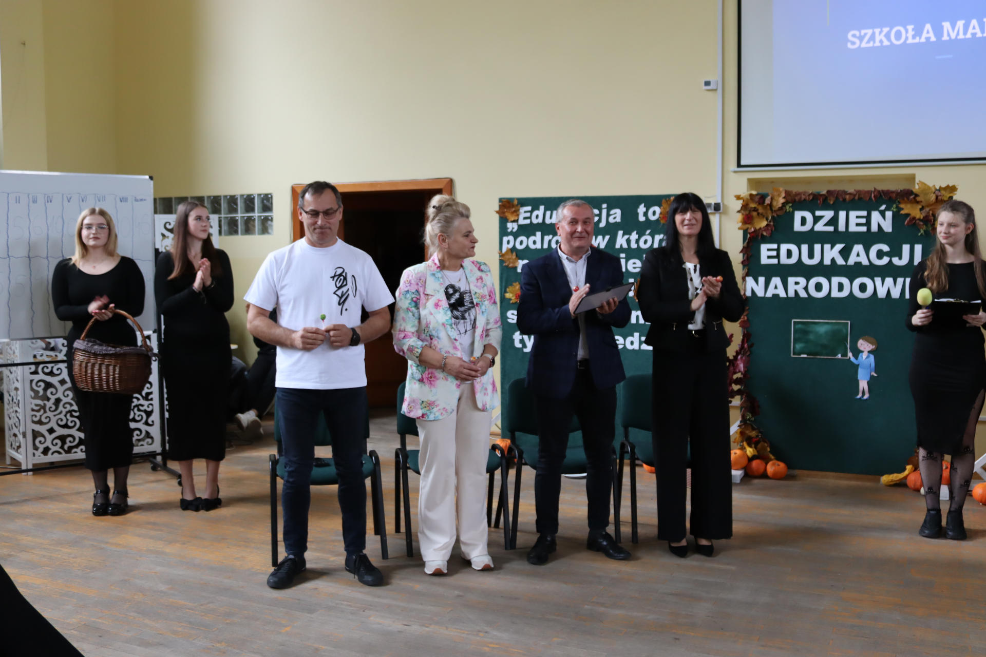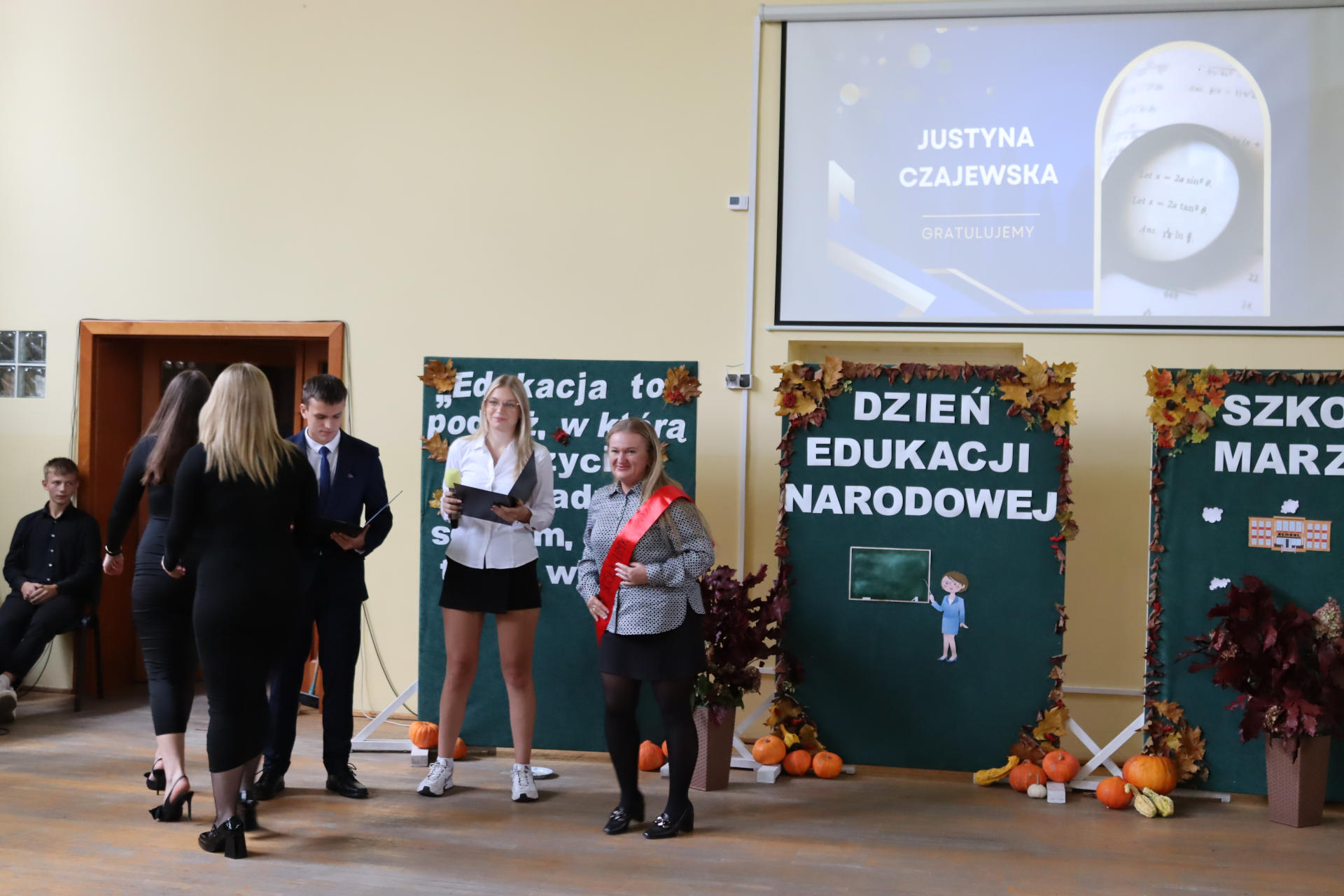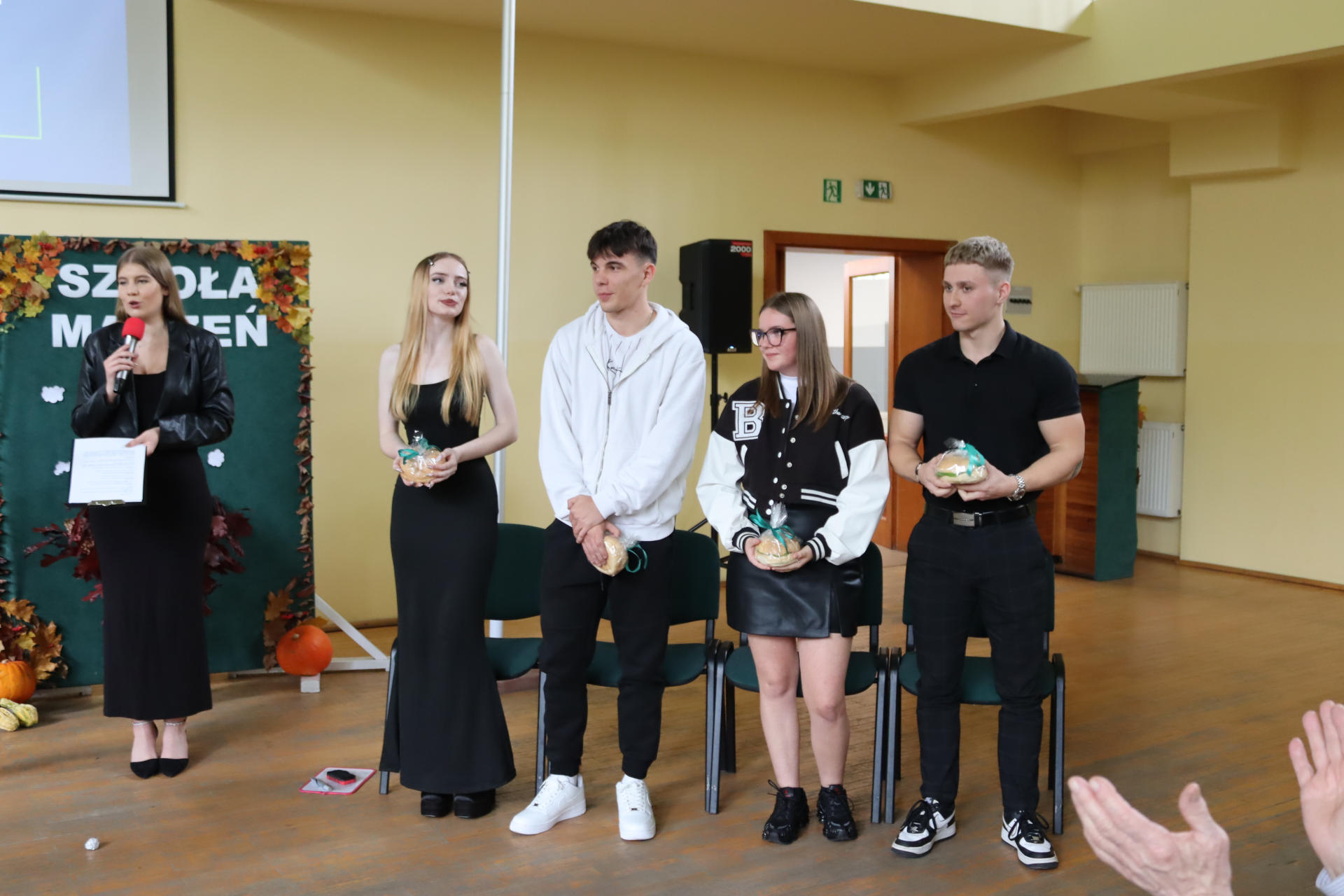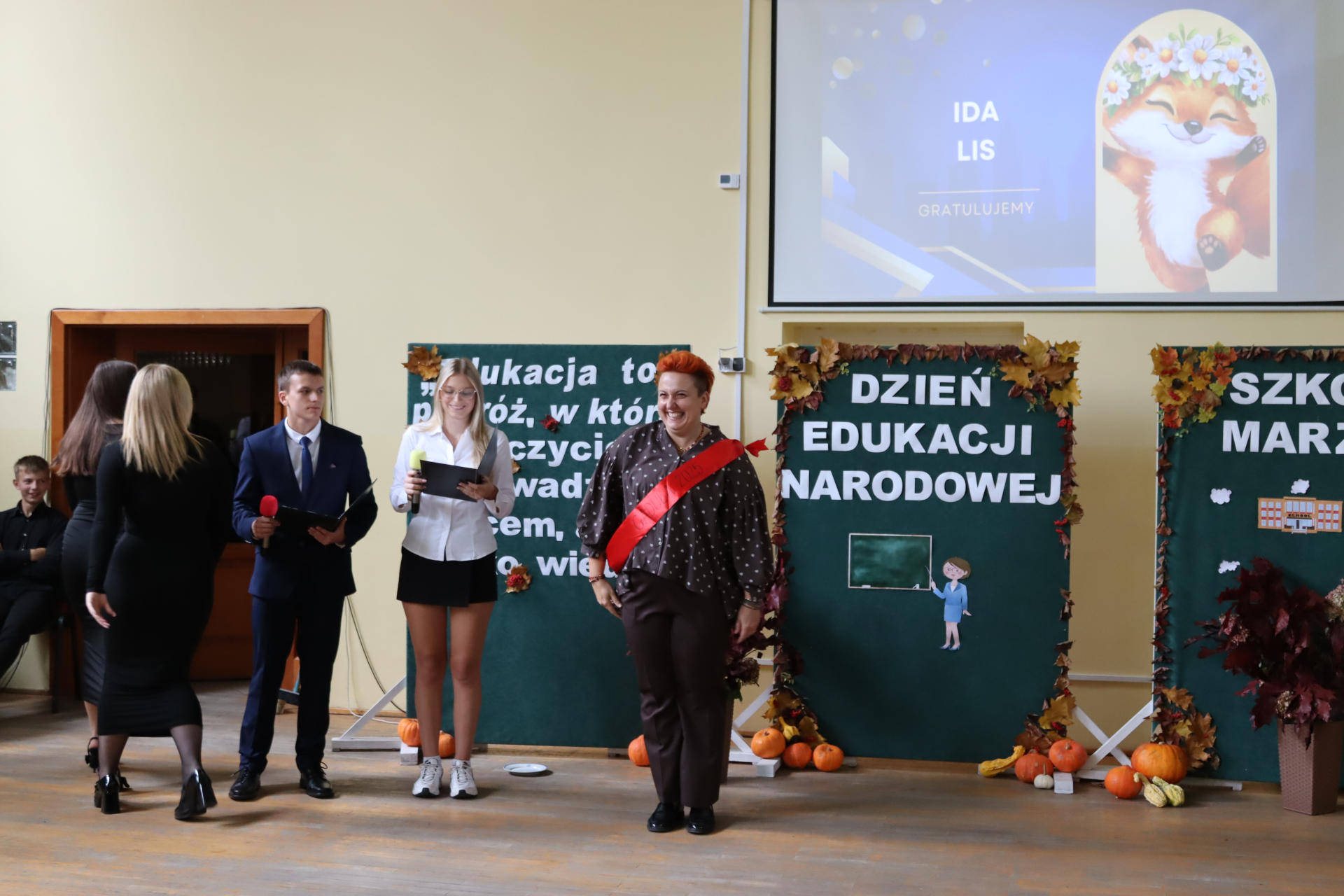 Po wyprowadzeniu Pocztu Sztandarowego uczniowie klas czwartych technikum zaprezentowali humorystyczne scenki z życia szkoły, sparodiowali ulubionych nauczycieli i przyznali swoje tradycyjne nagrody Sylwki w różnych kategoriach. Uśmiech z twarzy licznej widowni nie schodził do końca spotkania, które zwieńczone zostało słodkim i zdrowym podarunkiem w postaci jabłka dla każdego pracownika Szkoły.