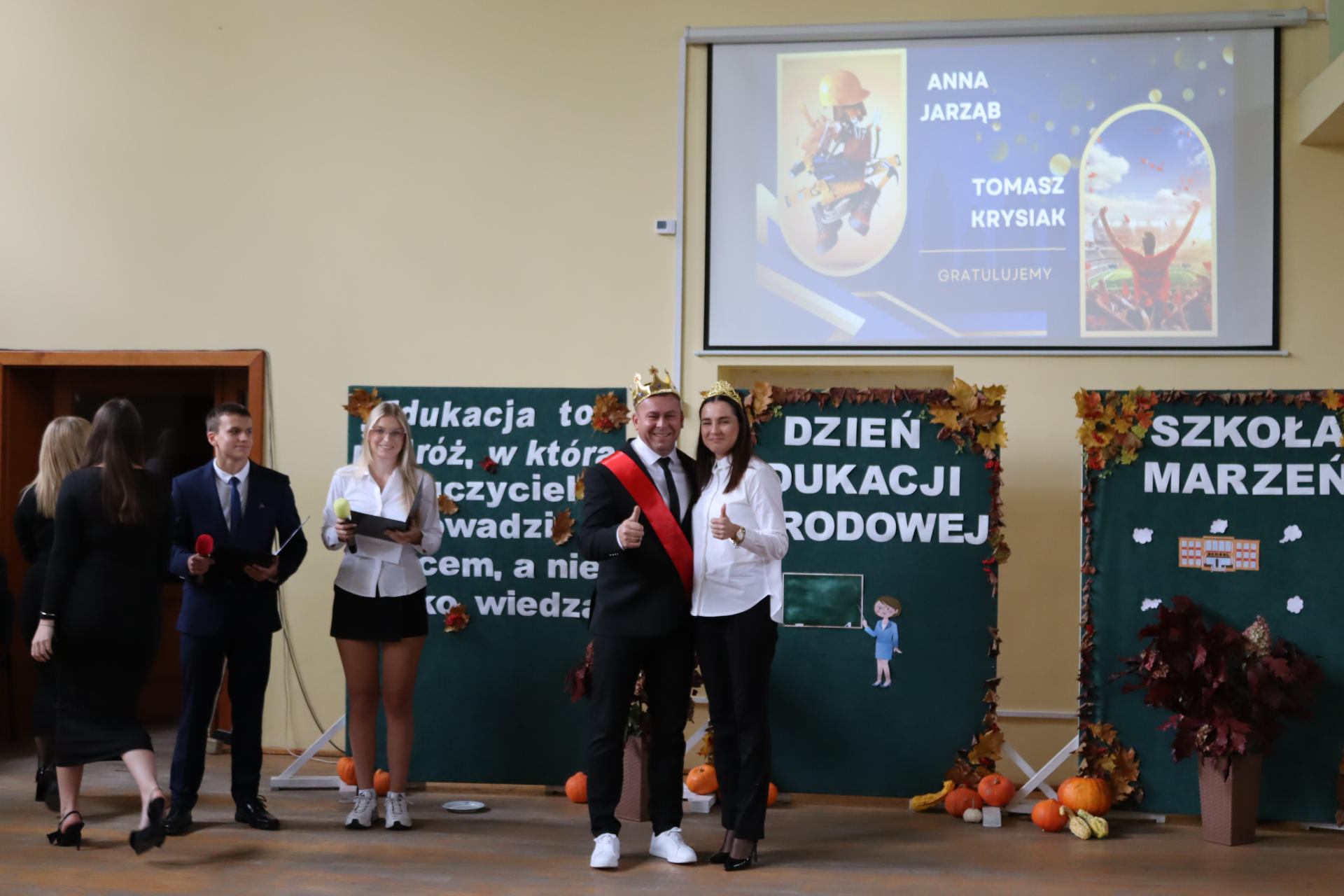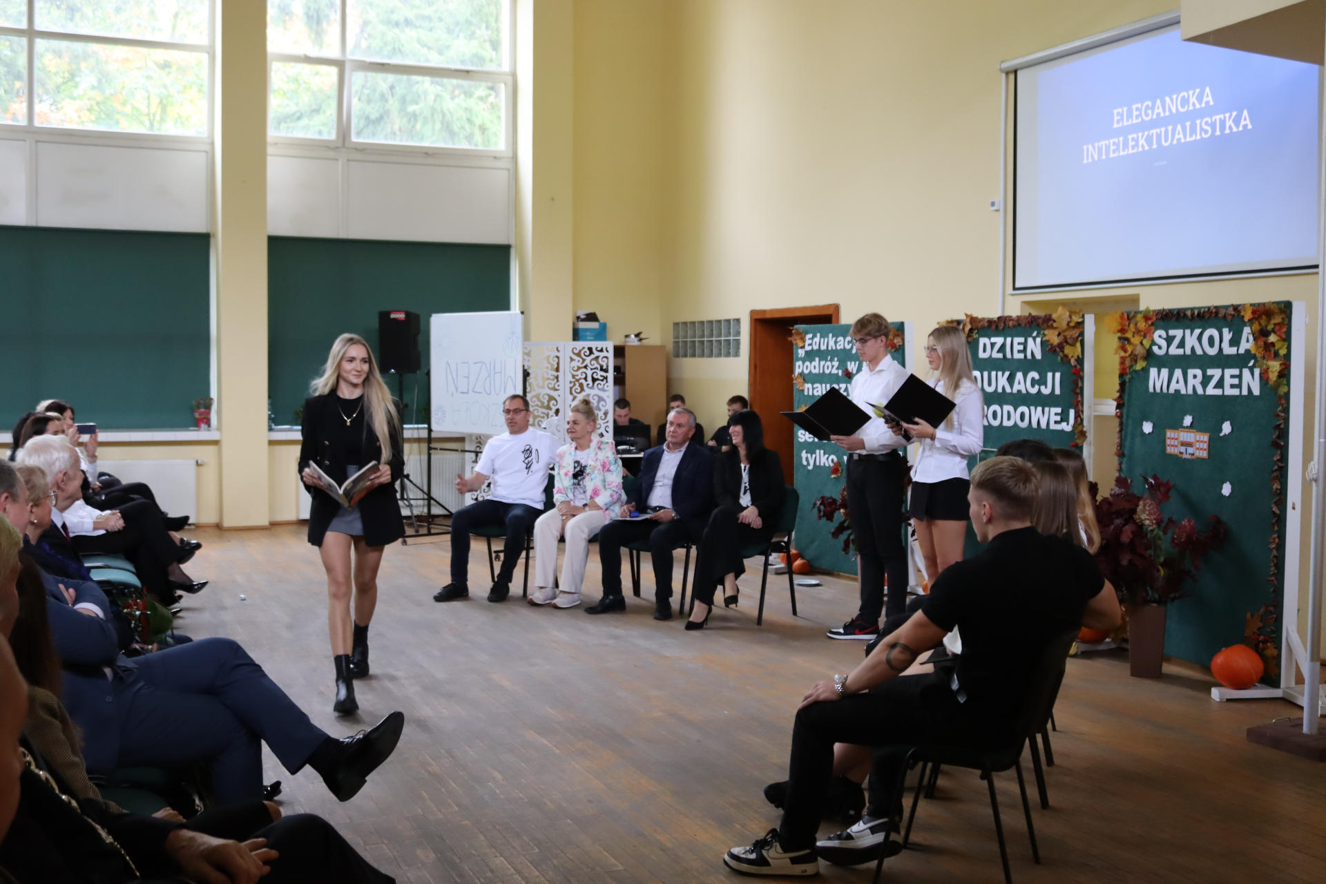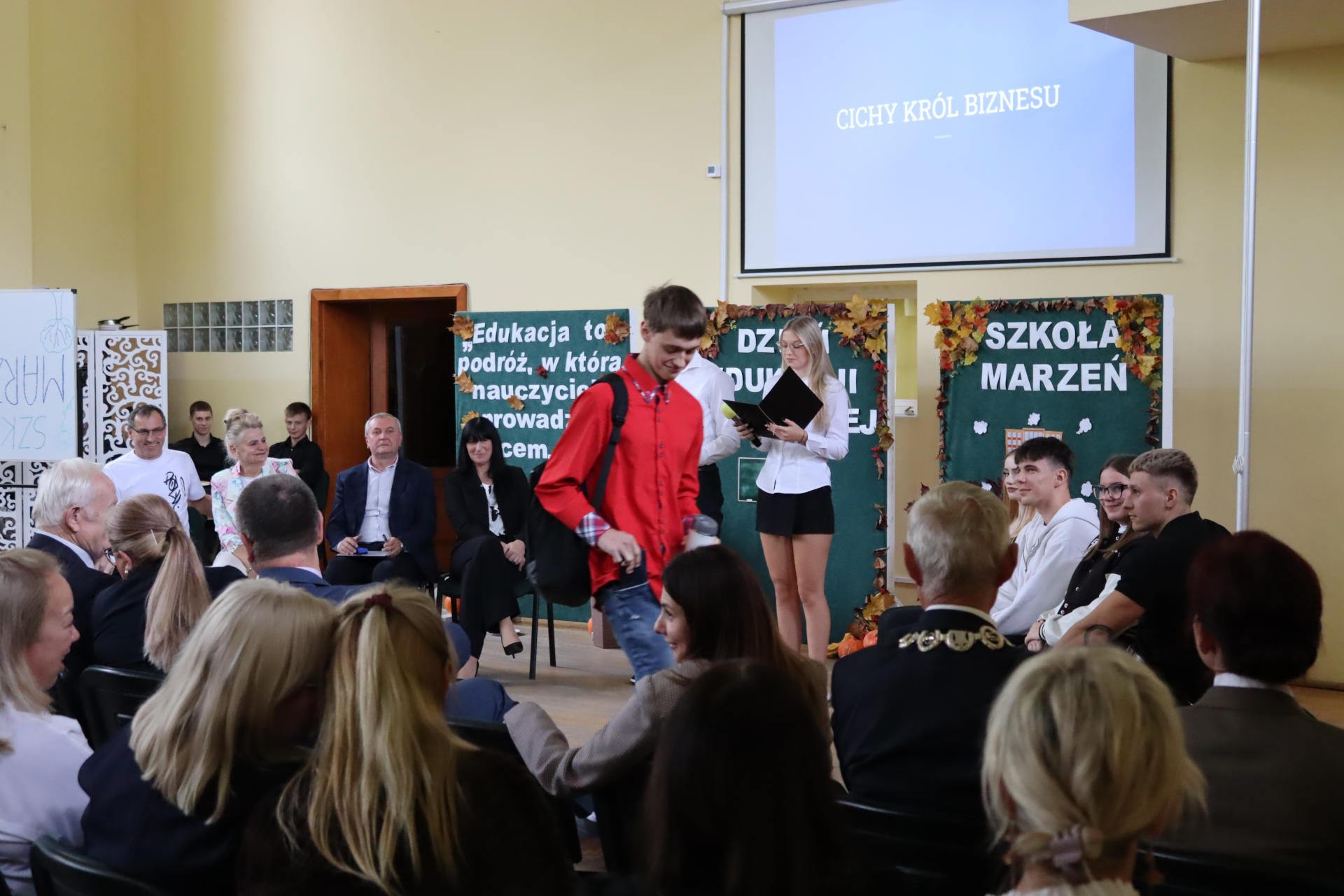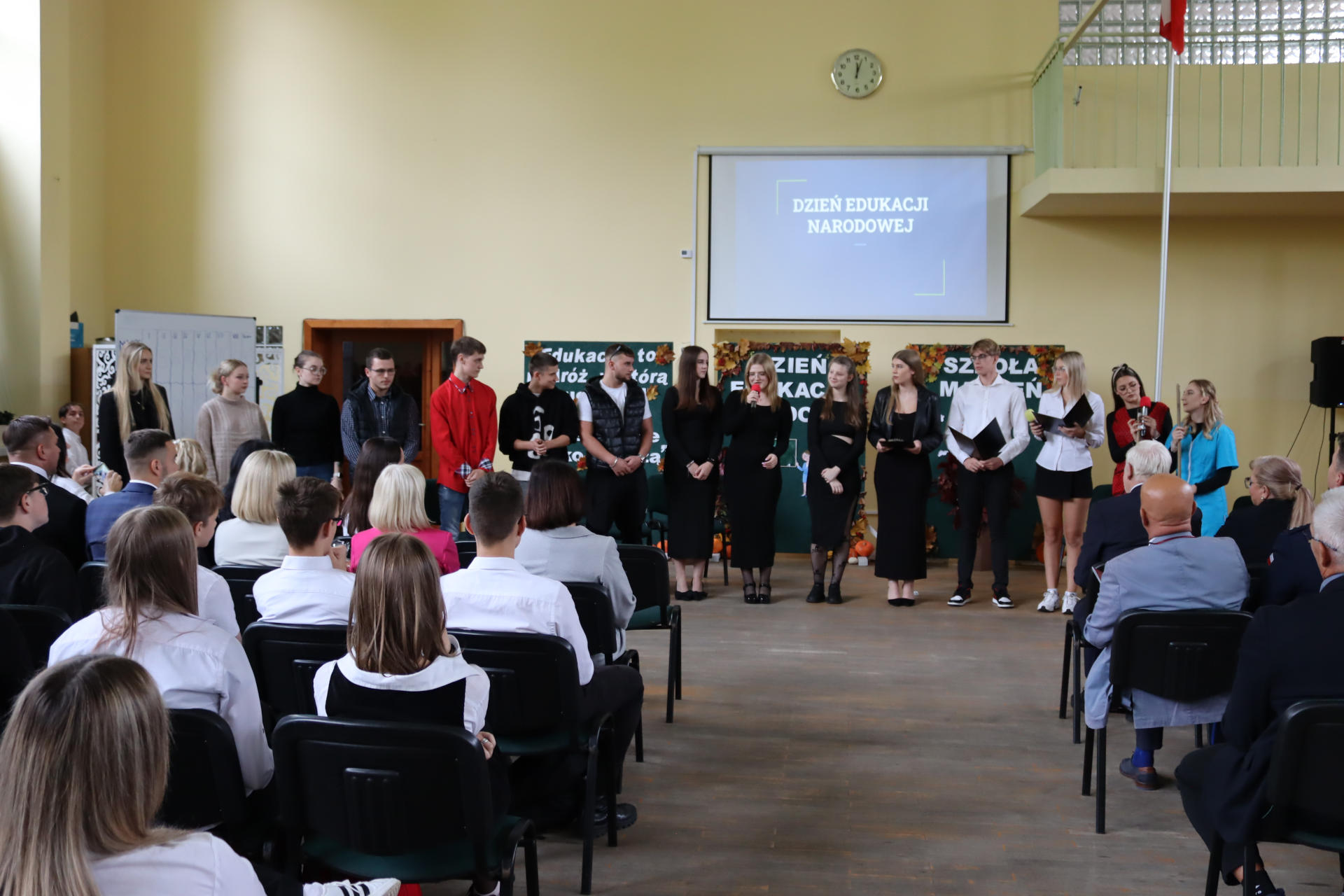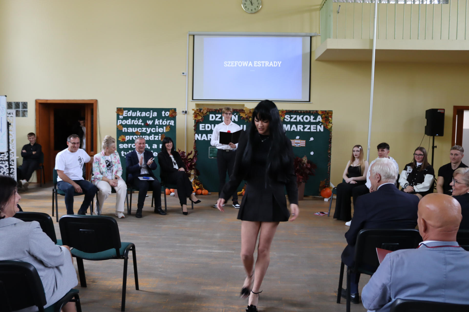Po wyprowadzeniu Pocztu Sztandarowego uczniowie klas czwartych technikum zaprezentowali humorystyczne scenki z życia szkoły, sparodiowali ulubionych nauczycieli i przyznali swoje tradycyjne nagrody Sylwki w różnych kategoriach. Uśmiech z twarzy licznej widowni nie schodził do końca spotkania, które zwieńczone zostało słodkim i zdrowym podarunkiem w postaci jabłka dla każdego pracownika Szkoły.
