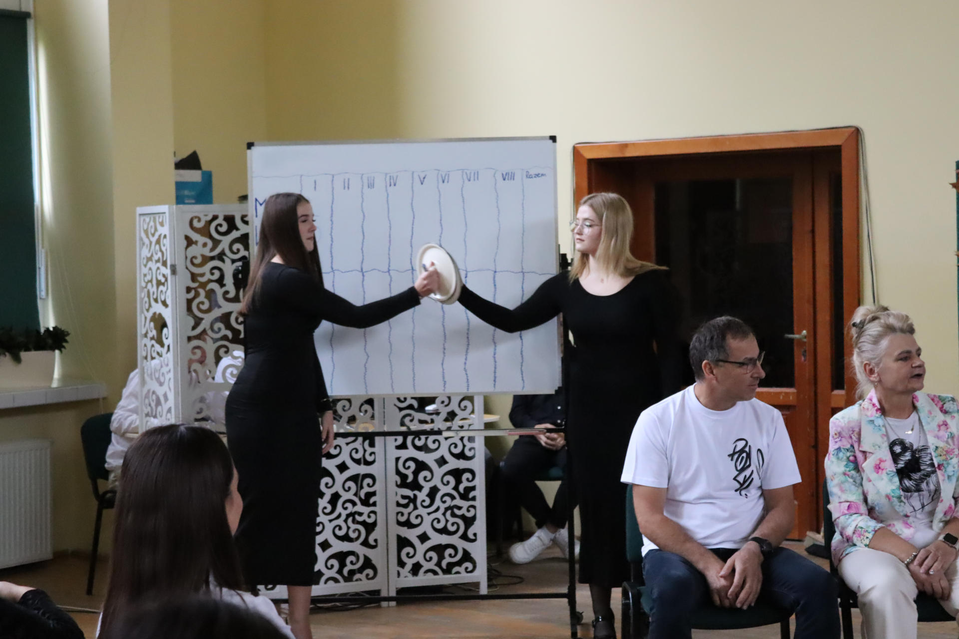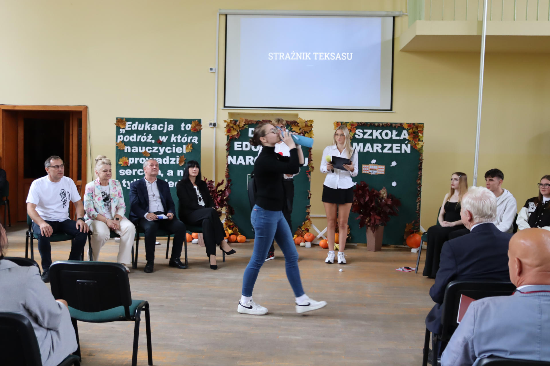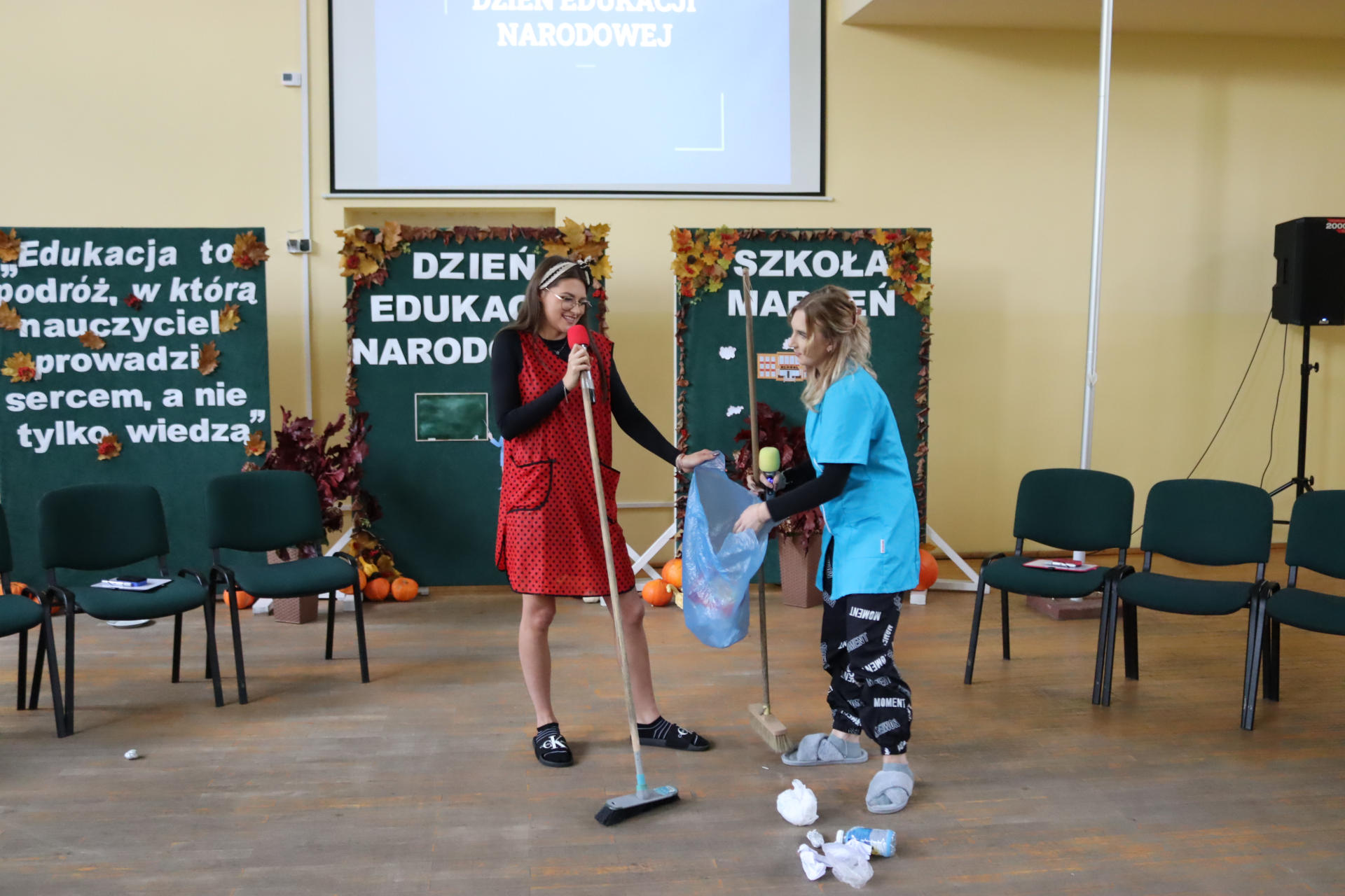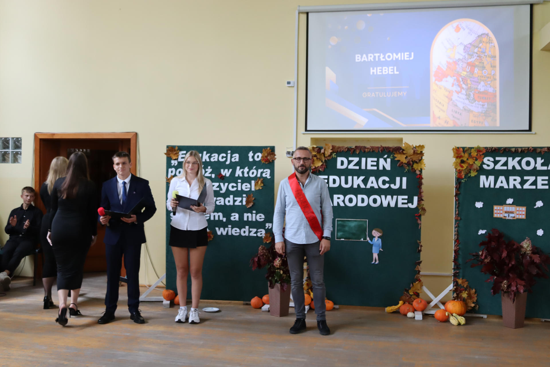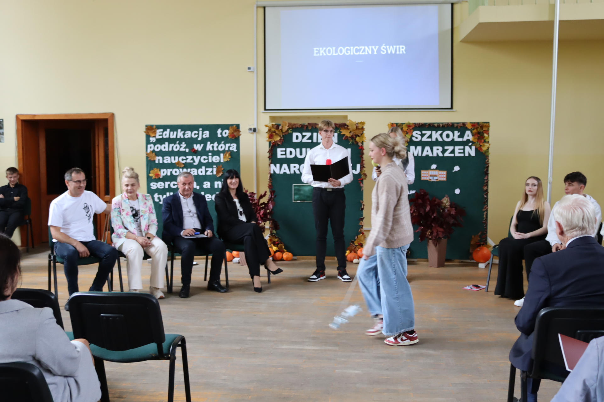 Po wyprowadzeniu Pocztu Sztandarowego uczniowie klas czwartych technikum zaprezentowali humorystyczne scenki z życia szkoły, sparodiowali ulubionych nauczycieli i przyznali swoje tradycyjne nagrody Sylwki w różnych kategoriach. Uśmiech z twarzy licznej widowni nie schodził do końca spotkania, które zwieńczone zostało słodkim i zdrowym podarunkiem w postaci jabłka dla każdego pracownika Szkoły.